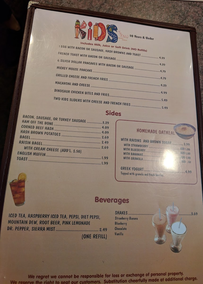 For the little ones, the kids' menu features delicious choices such as eggs with bacon or sausage paired with hash browns and toast, perfect for fueling their day. Sip on refreshing beverages like their Iced Tea or Raspberry Iced Tea, crafted to complement your meal.